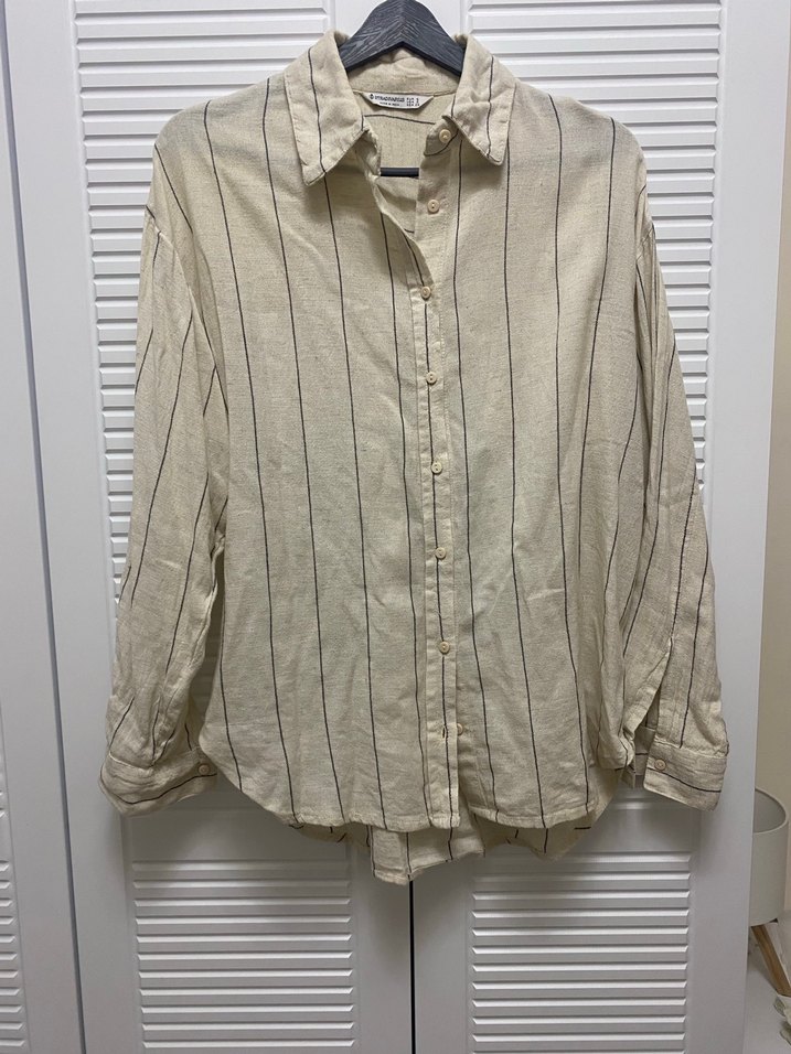 Bej keten kumaştan, uzun kollu ve düğmeli kadın gömleği. Yaka kısmı klasik, bol kesim ve çizgili desene sahip, günlük kullanıma uygun.