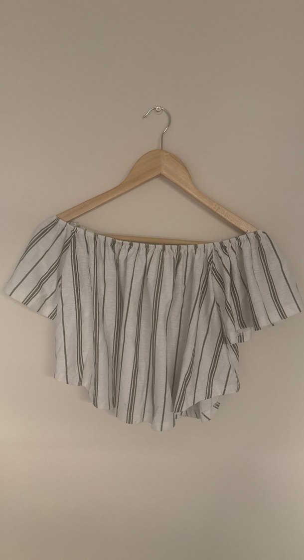 Bej ve gri çizgili keten kumaştan, kayık yaka, kısa kollu, pileli ve bol kesim bluz. Bohem tarz için uygundur.