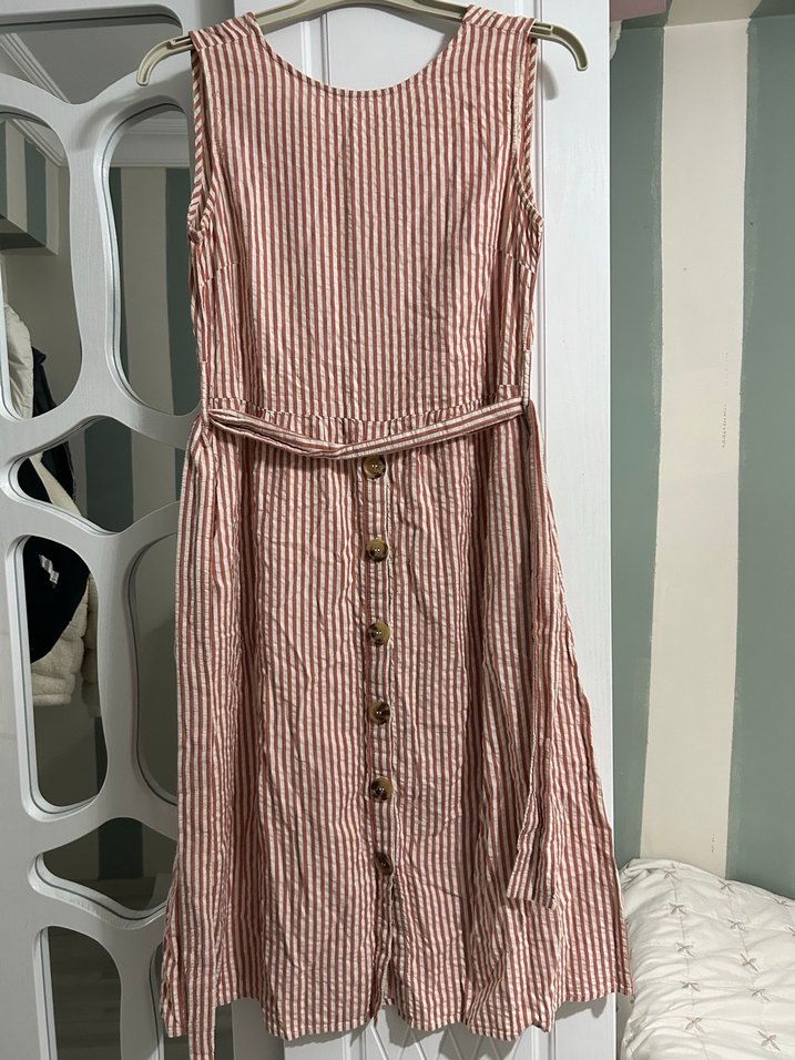 Bej çizgili keten kumaştan, ince askılı, düğmeli ve kemerli midi boy bol kesim elbise. Günlük kullanım için bohem tarzda. Önlü arkalı gitmeli