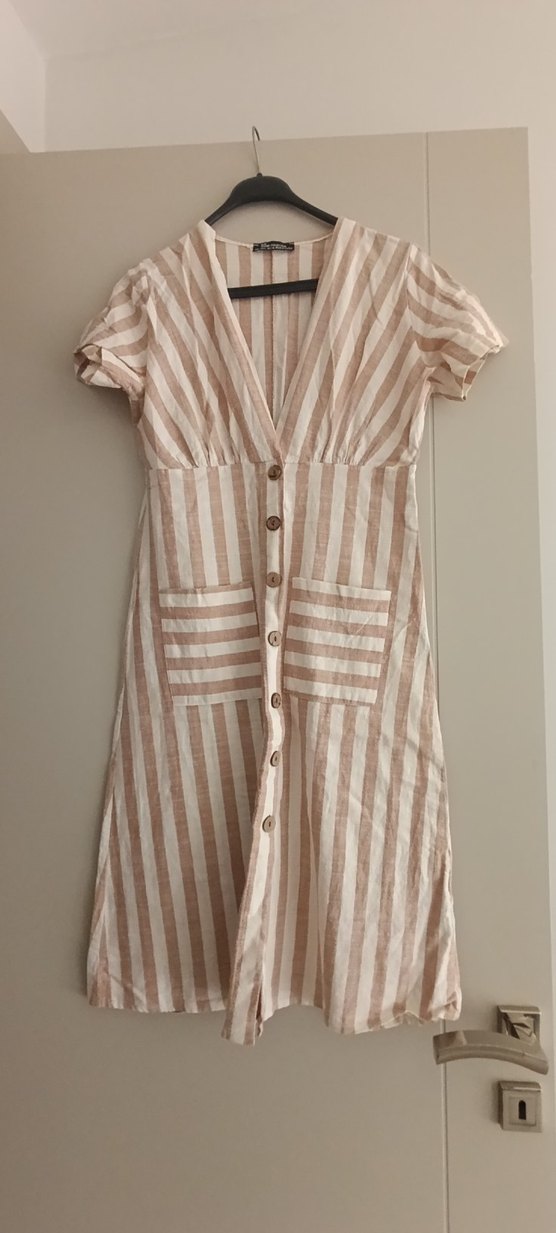 Bej çizgili keten midi elbise, V yaka, kısa kollu ve düğmeli ön detayına sahiptir. Rahat, bol kesim bohem tarzda, günlük kullanım için uygundur.