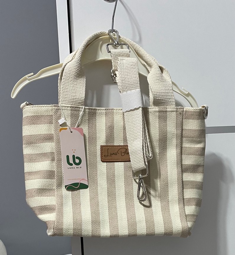 Dokuma kumaştan yapılmış, çift saplı ve ayarlanabilir askılı, bej çizgili, mini tote kadın çantası. Günlük sokak stiline uygun, rahat kullanımlı. Çıtçıtlı kapama, içinde fermuarlı geniş bir bölüm var. Marka Luna blu Boy 22 cm Genişlik 32 cm