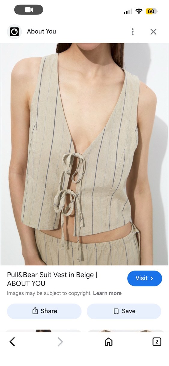 V yaka, düğmeli ve kısa kesim olan bu bej keten yelek, ince çizgili. Günlük kullanıma uygundur.