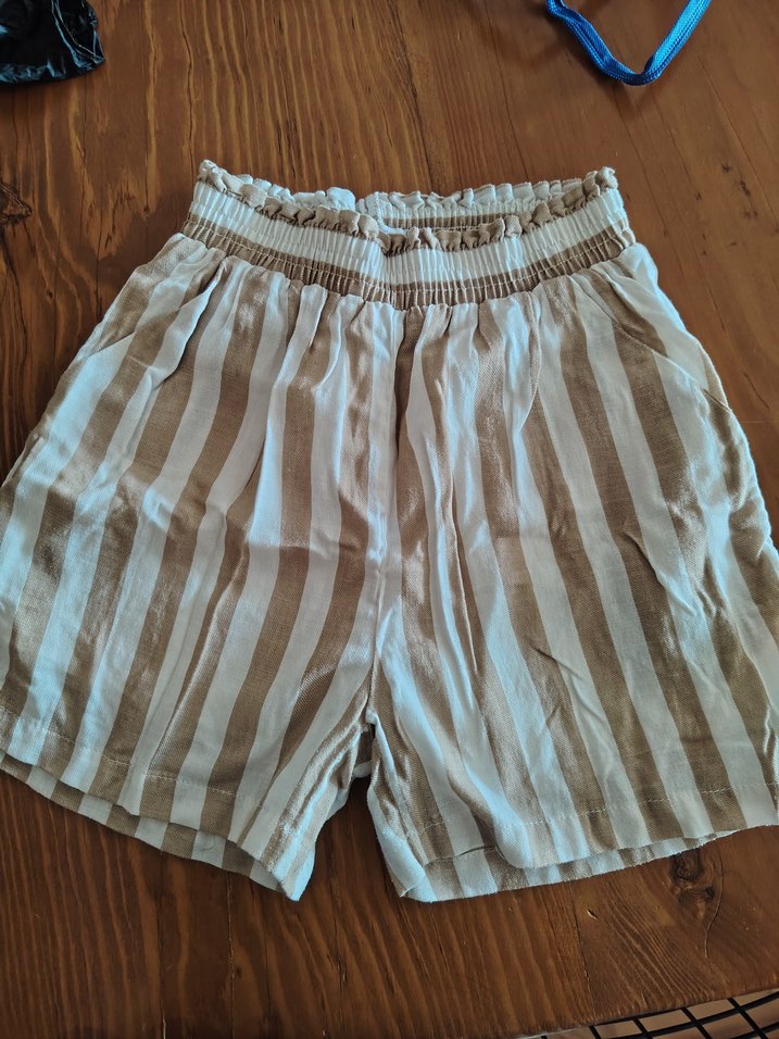 Yumuşak keten kumaştan, bol kesim bej hamile şortu. Dikey çizgili ve pile detaylı, rahat ve bohem tarzda.