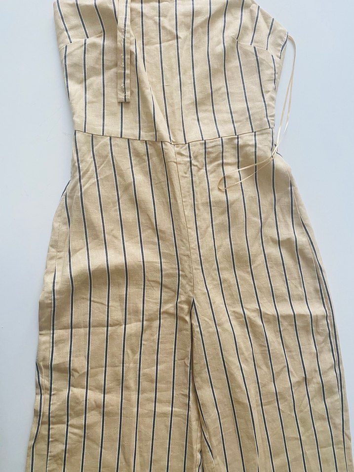 Bej keten kumaştan, askılı kollu ve pile detaylı tulum. Normal kesim ve çizgili desene sahip, sokak modasına uygun.sırt dekolteli