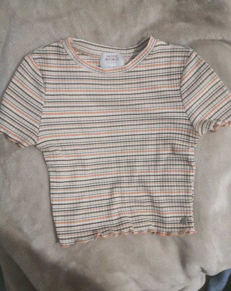 Bej Çizgili Kısa Kollu Crop Tişört 13 14 15 yaş icin uygun