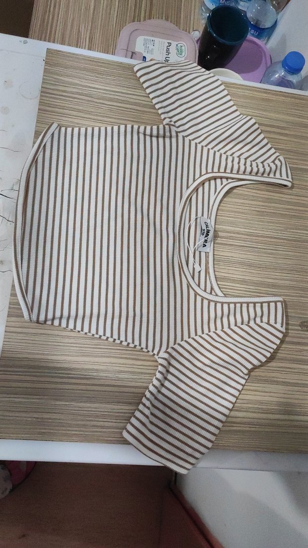 Bej renkli, kısa kollu ve tekne yaka crop top. İnce çizgili ve pile detaylı, hafif esnek yapıda, günlük kullanıma uygun.