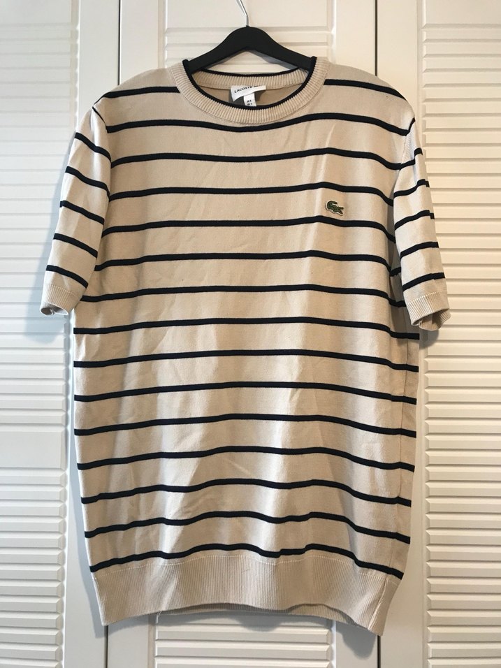 Bej renkli, kısa kollu ve yuvarlak yakalı pamuklu erkek tişörtü. Çizgili deseni ve rahat kesimiyle günlük kullanıma uygun şık bir parça.