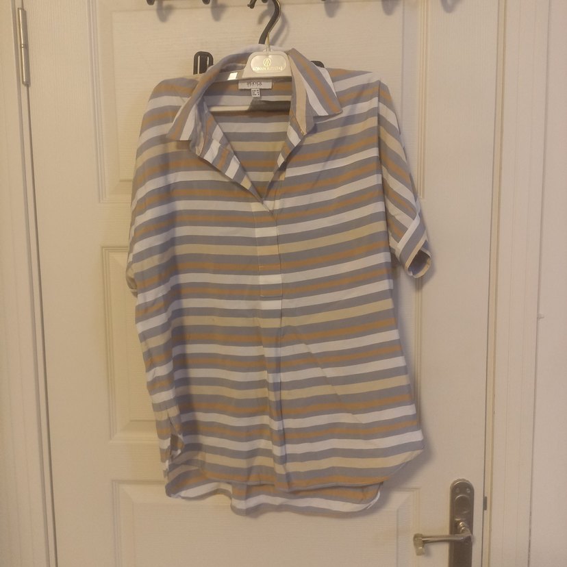 Bej ve gri çizgili, kısa kollu, yakalı ve düğmeli kadın gömleği. Rahat kesimi ve sentetik kumaşıyla günlük kullanım için uygundur.