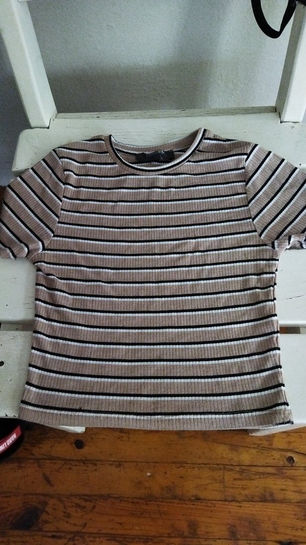 Bej Çizgili Kısa Kollu Kadın Tişört - Görsel 6