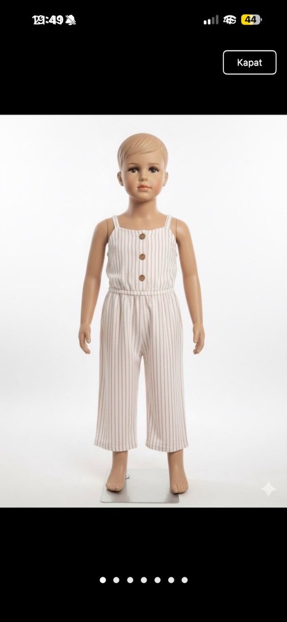 İnce askılı, düğmeli ve çizgili desenli bej renkli pamuklu kız tulumu, rahat normal kesim.