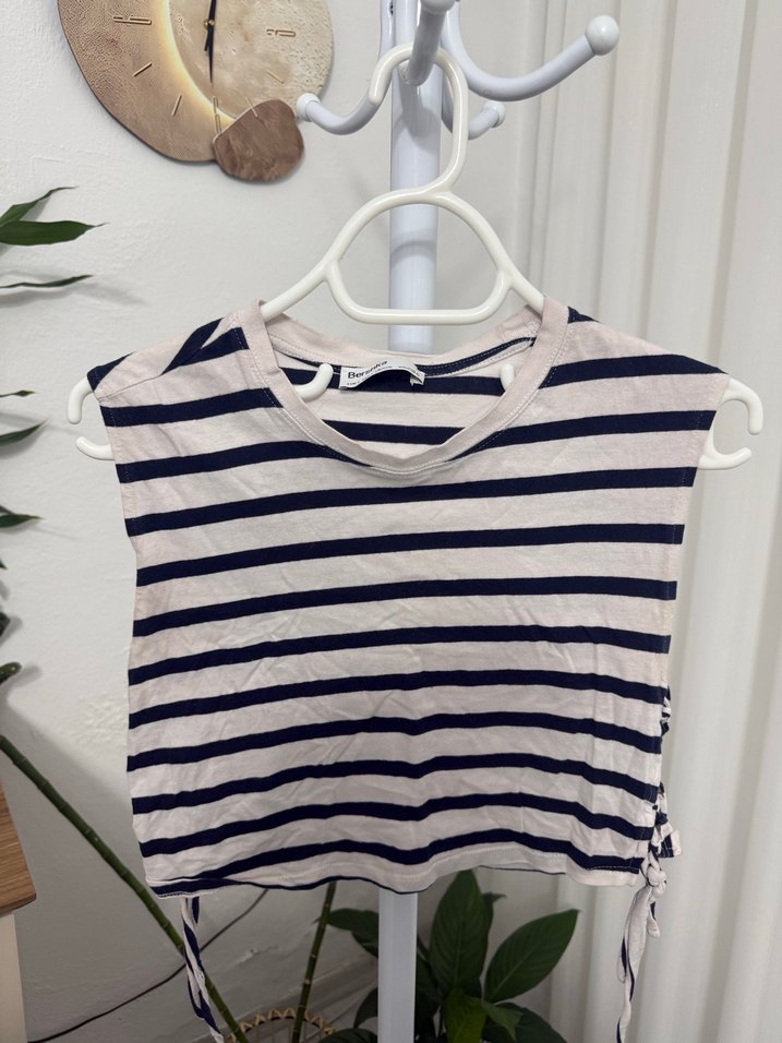 Krem ve lacivert çizgili, kolsuz ve kısa kesim crop top. Pilili detaylara sahip, rahat sentetik kumaştan üretilmiştir.