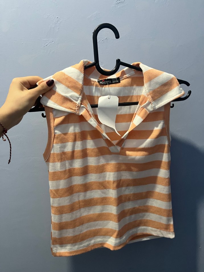 Bej Çizgili Kolsuz Triko Kadın Gömlek