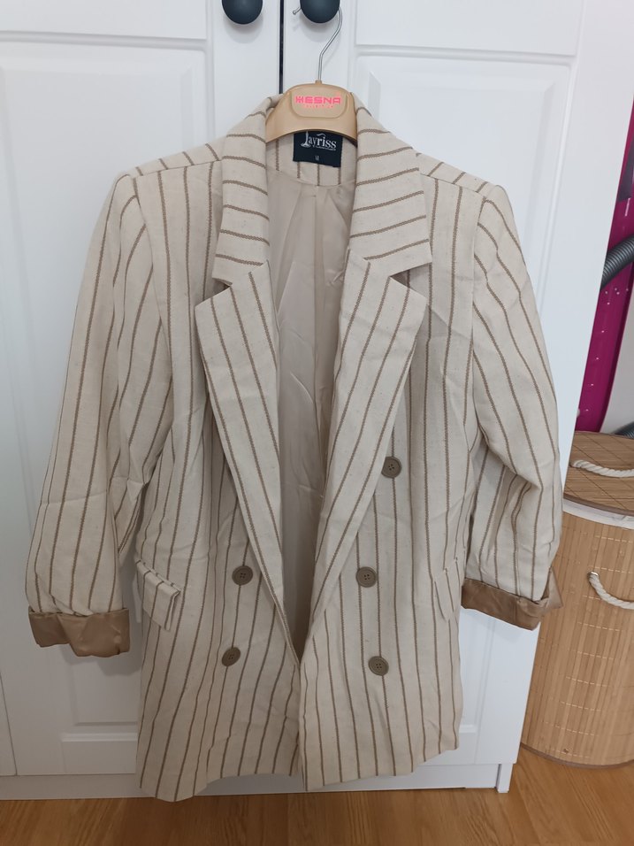 Bej çizgili midi blazer, kesik yakalı ve düğmeli. Keten kumaştan, askılı kollu, rahat kesimli, trend sokak stili için uygun. Ofis kullanımı için ideal.