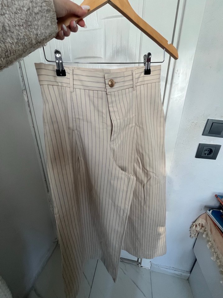 Bej Çizgili Midi Kadın Kumaş Pantolon
