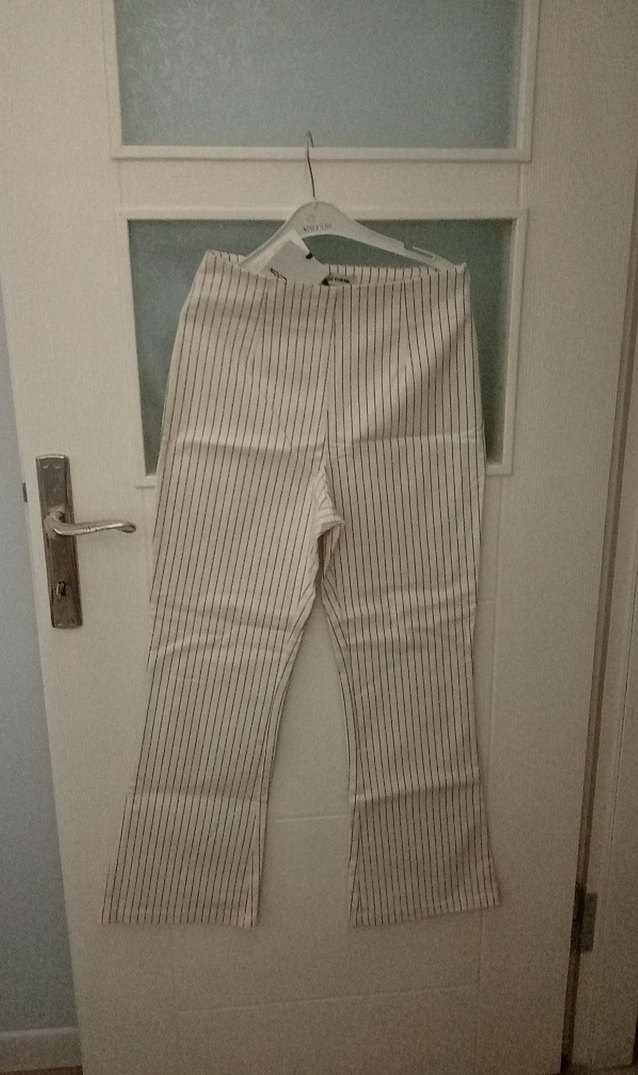 Bej renkli, midi boy, regular fit pantolon. Çizgili desene ve pilili detaylara sahip, yumuşak sentetik kumaştan üretilmiştir.