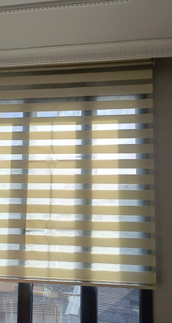 Hafif bej renkli yatay çizgilerle modern tarzda perde, yumuşak ışık geçişi sağlar.