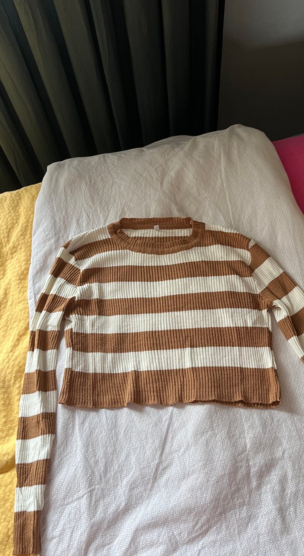 Bej renkli, uzun kollu ve yuvarlak yakalı örgü kadın kazak. Çizgili deseni ve rahat kesimiyle günlük sokak stiline uygundur. m beden yazıyor ancak xs s bedene daha iyi