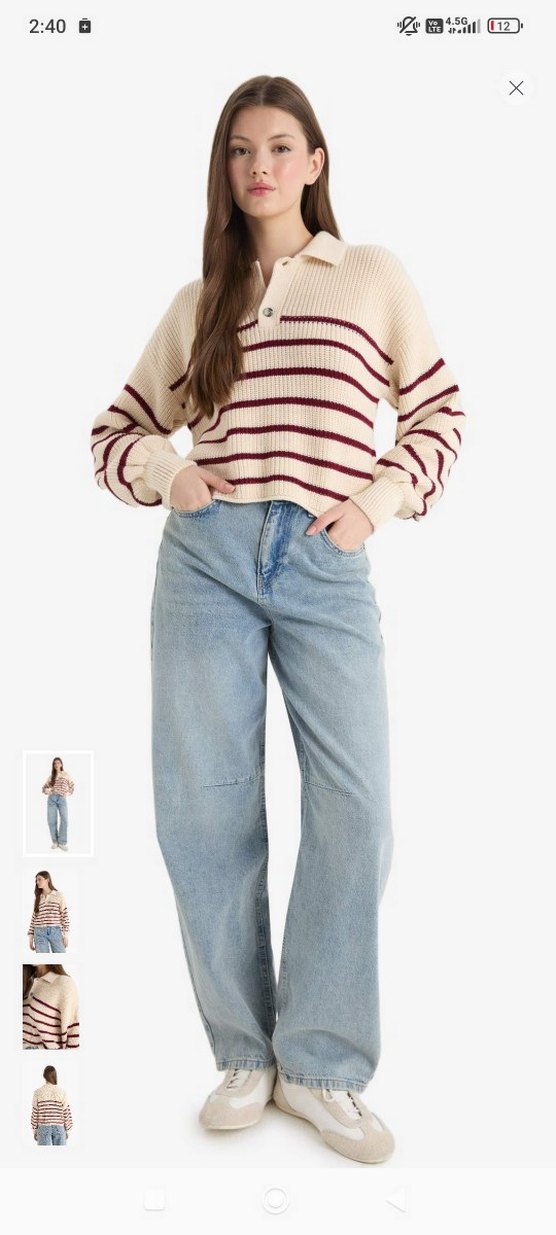 Bordo çizgili, bej renkli örgü kazak, bol kesim, uzun kollu ve yakalı, günlük sokak stiline uygun. Bir defa giydim.