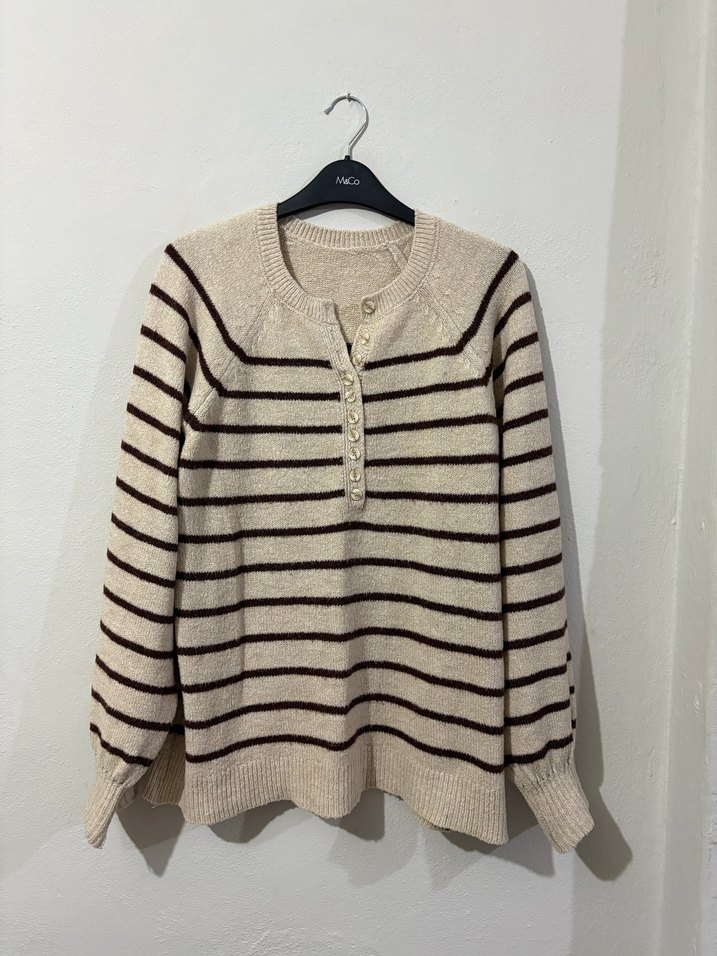 Bej renkli, yuvarlak yaka ve uzun kollu örgü kazak. Gevşek kesim, yatay koyu çizgiler ve düğmeli detaylarla rahat ve bohem tarzı sunar.