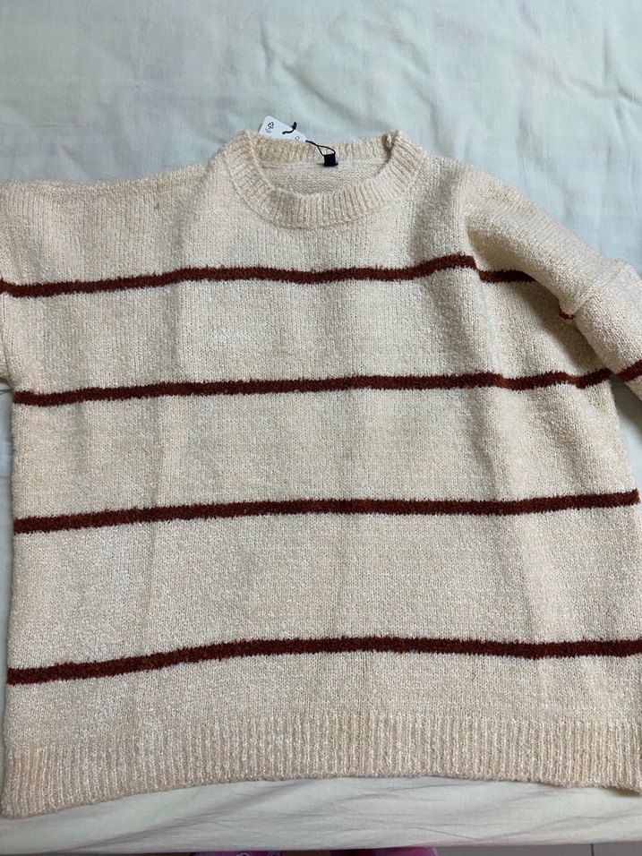 Bej renkli, uzun kollu ve yuvarlak yaka örgü kadın kazak. Rahat kesimi ve yatay çizgileriyle günlük sokak tarzına uygun.