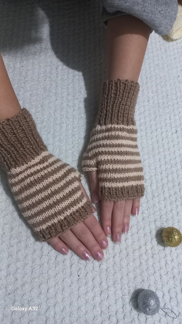 Bej renkli, çizgili örgü parmakları açık eldivenler, rahat ve bohem tarzda, sade ve basic görünüme uygun.