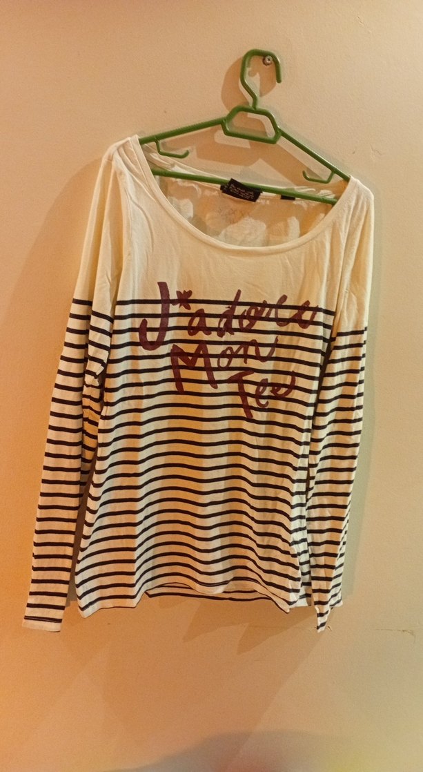 Bej renkli, uzun kollu ve kayık yaka hamile bluzu. Örme pamuktan, bol kesim ve Paris esintili baskılı çizgili desenlere sahip, günlük kullanıma uygun.