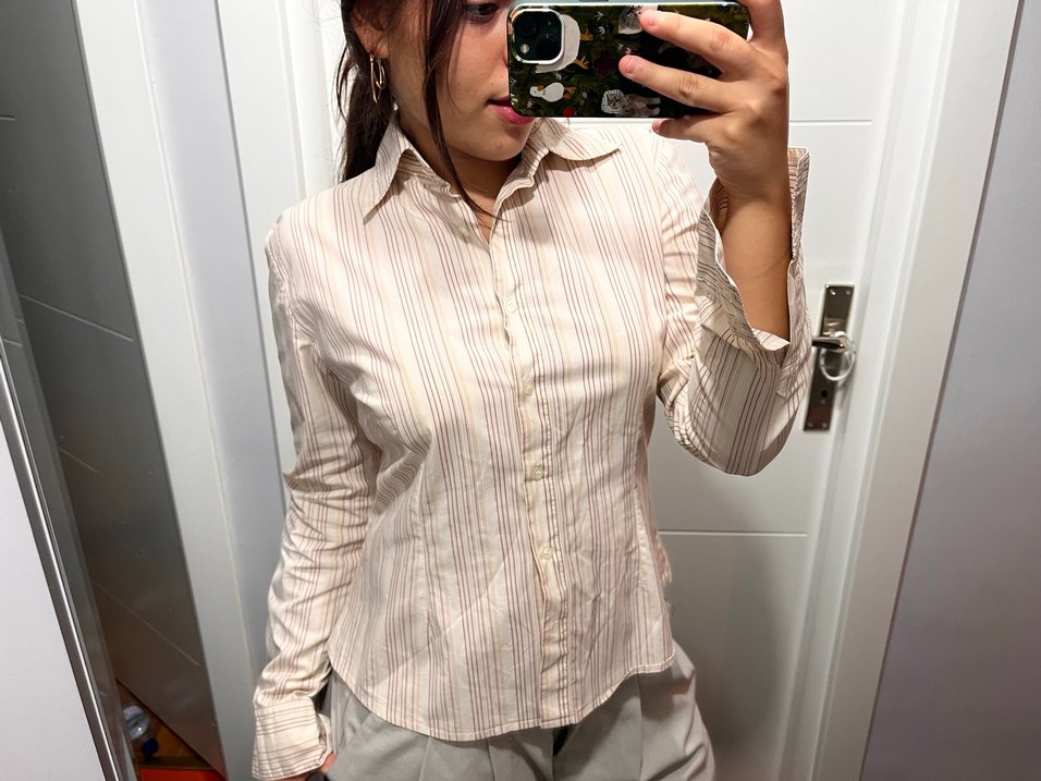 Bej renkli pamuklu kumaştan, uzun kollu, yakalı ve düğmeli önü olan çizgili fitted kadın gömlek. Ofis ve gündelik kullanıma uygun.