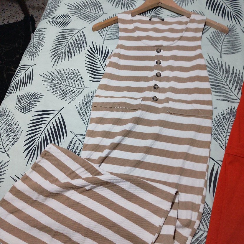 Bej ve beyaz çizgili hamile tulumu, tekne yaka ve düğmeli ön detaylara sahiptir. Pamuklu yumuşak kumaştan, rahat regular fit ve kolsuz tasarımla günlük sokak stiline uygundur.
