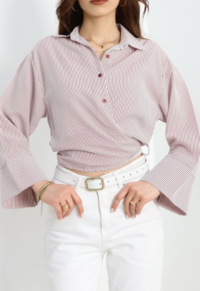 Bej çizgili kadın gömlek, yakalı ve düğmeli. Pamuklu yumuşak kumaştan, bol kesim ve uzun kollu, günlük sokak stili için uygun. S ve XXL bedenleri mevcuttur.
