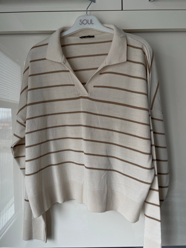 Bej çizgili, pamuklu, uzun kollu, yakalı ve bol kesim kadın trikosudur. Günlük sokak stili için uygundur ve yumuşak dokuludur.