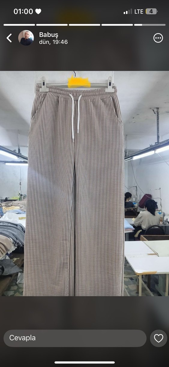 Bej renkli, çizgili desenli ve pilili midi uzunlukta kumaş pantolon. Kendi atolyemizde dikiyoruz s- xxl arasi bedenler mevcuttur Sarı kahverengi bej mavi pembe siyah renkleri vardır