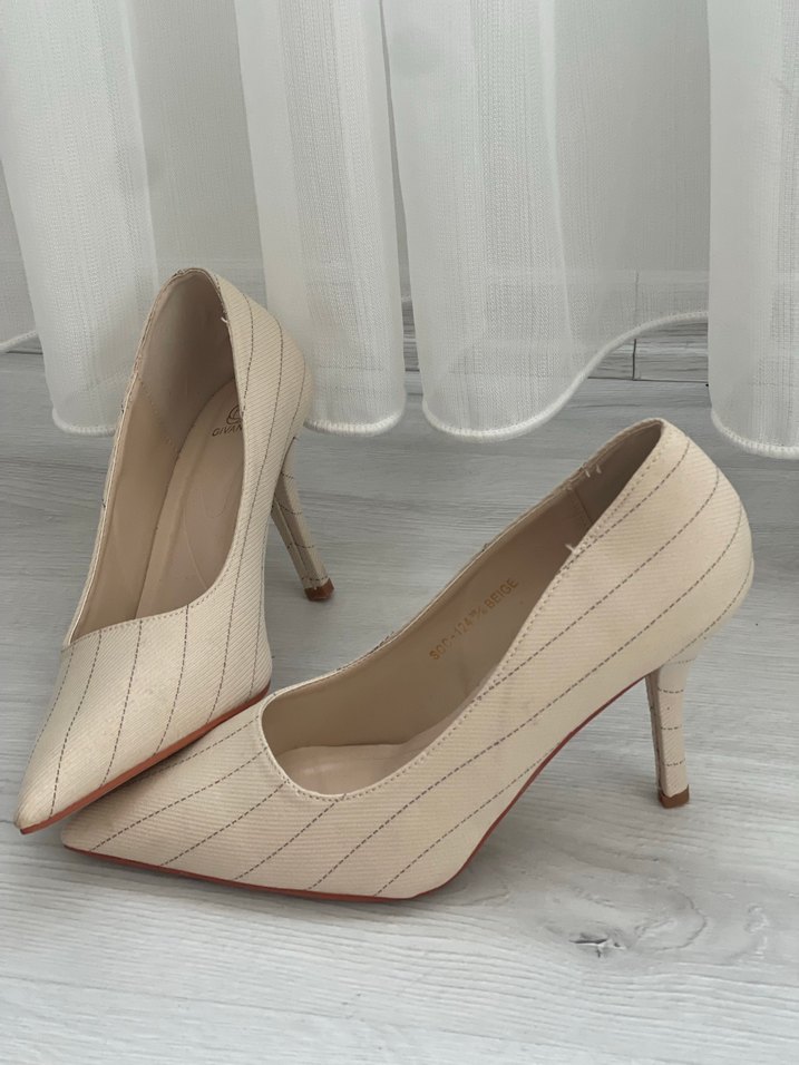 Sentetik kumaştan yapılmış, çizgili ve pilili bej stiletto topuklu ayakkabı, olmadigi için satıyorum Hiç kullanilmadi