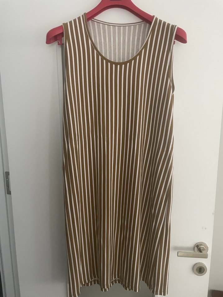 Bej çizgili, kolsuz uzun elbise, yumuşak sentetik kumaştan. Geniş kesim ve piliseli tasarıma sahip, bohem tarzda. Çok rahat. Hiç giyilmedi. Sadece yıkandı. Mağaza ürünü