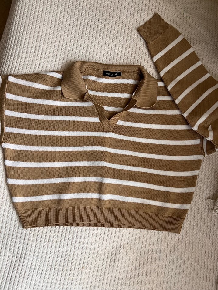Bej çizgili, polo yaka ve uzun kollu triko kazak. Salaş kesim ve normal boydadır, günlük sokak stili için uygundur.