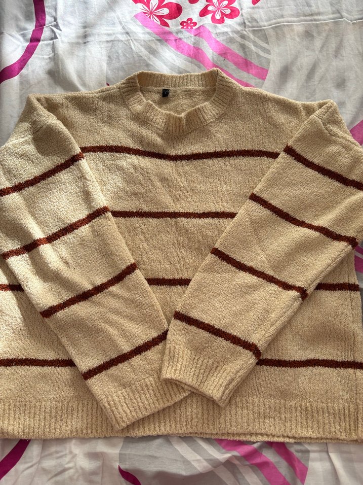 Bej renkte, uzun kollu ve yuvarlak yakalı, çizgili triko kadın kazak. Rahat kesimi ve yumuşak dokusuyla günlük kullanıma uygundur.