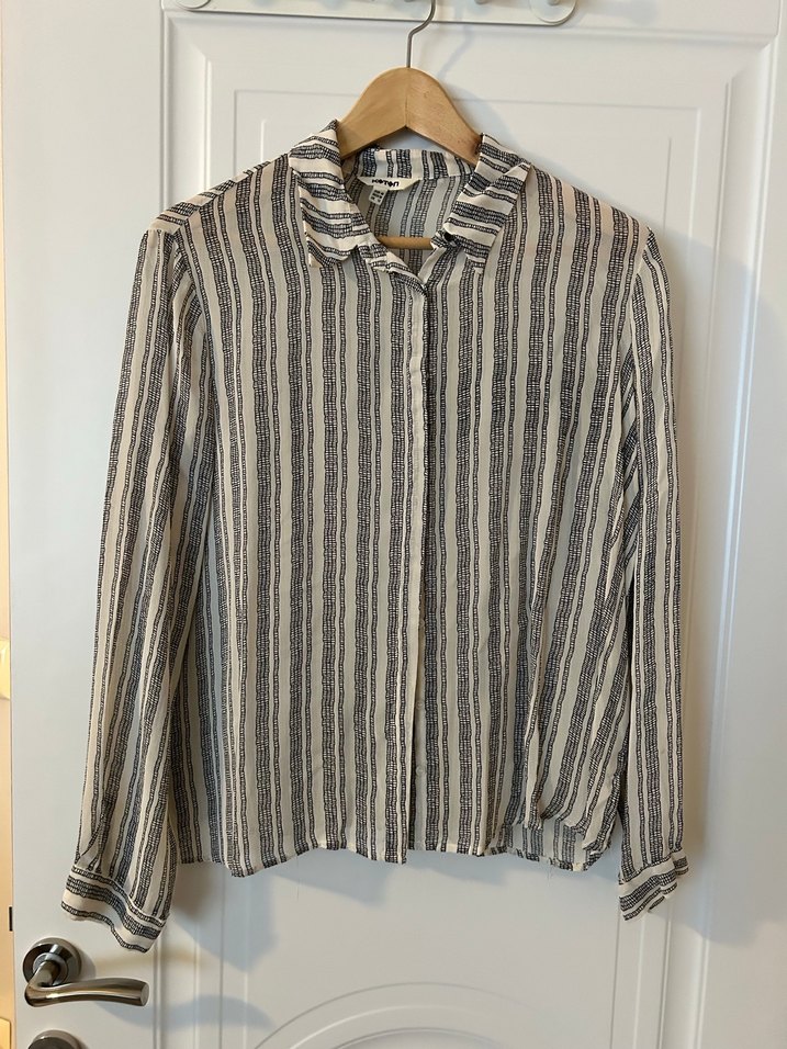 Bej renkli, uzun kollu, yakalı ve düğmeli gömlek. Salaş kesimi ve çizgili deseniyle ofis ve günlük kullanıma uygundur.