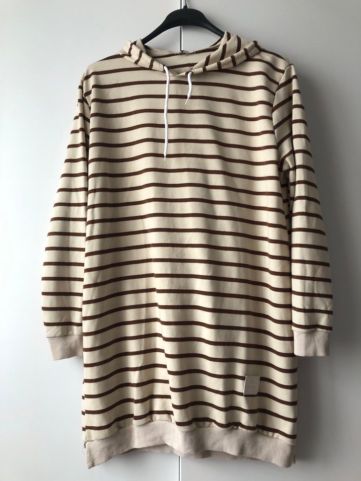 Bej renkli, kahverengi çizgili, uzun kollu, kapüşonlu sweatshirt. Rahat kesimiyle günlük kullanıma uygundur.