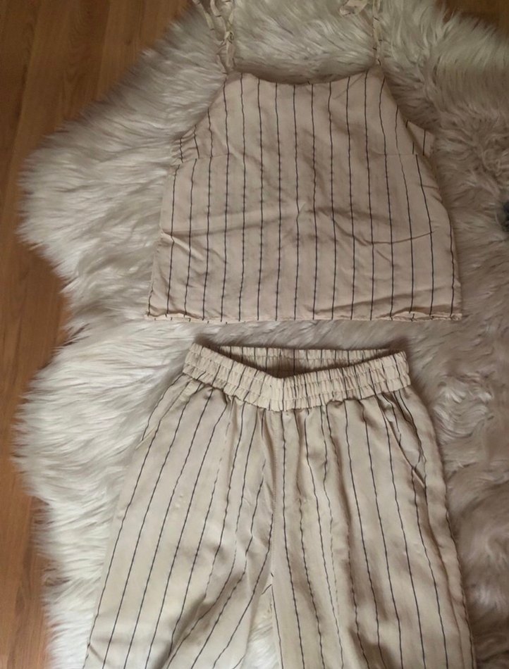 Pastel bej renkli, ince dikey çizgili, bol kesim.Sadece bir kere giyildi.