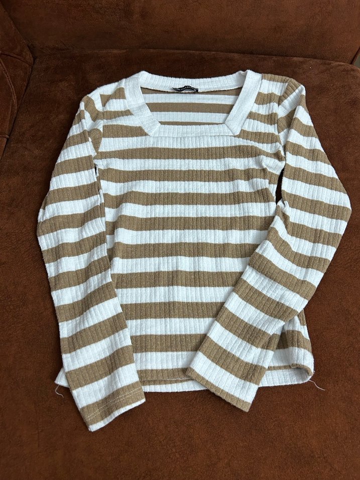Bej çizgili triko kadın kazak, uzun kollu ve kayık yaka detaylıdır. İnce kesimi ve midi boyu ile günlük rahat kullanıma uygundur. Örgü kumaşıyla konfor sunar.