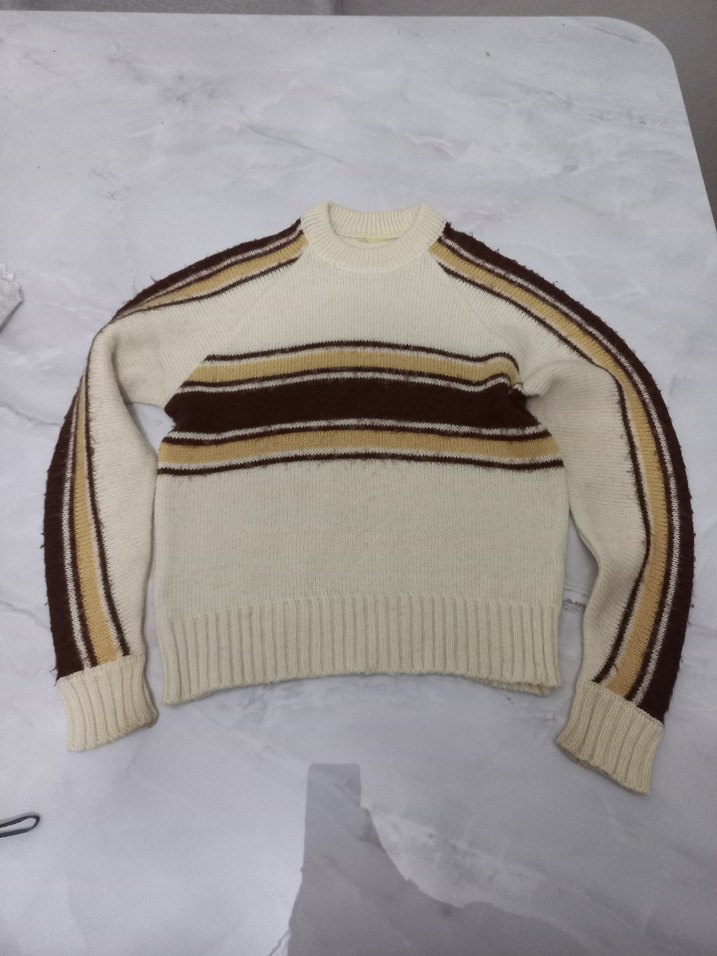 Bej renkli, uzun kollu, bisiklet yaka ve bol kesim triko kazak. Kahverengi ve sarı çizgilerle retro ve rahat bir görünüm sunar.