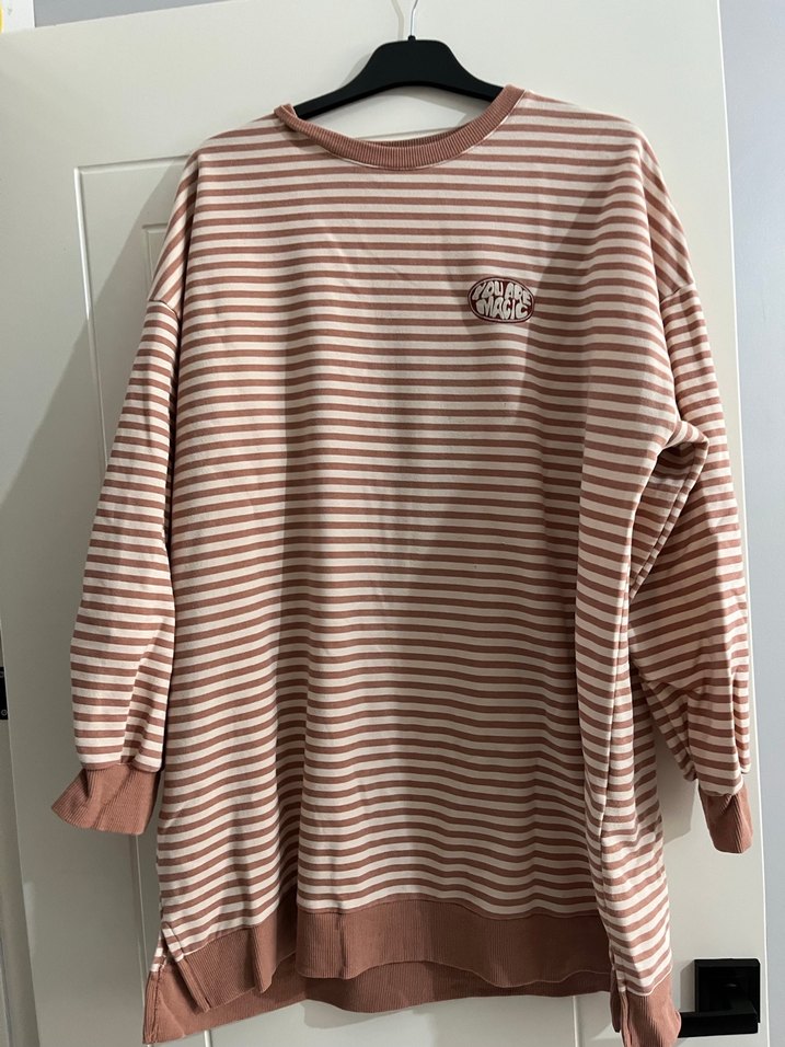 Pamuklu, örme dokulu, bej pastel çizgili, uzun kollu, yuvarlak yakalı, midi uzunlukta, bol kesim