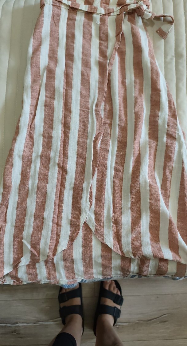 Nefes alabilen keten kumaştan, bohem tarzda dikey çizgili, bol kesim ve drapeli açık bej bağlamalı etek. Günlük kullanıma uygun.
