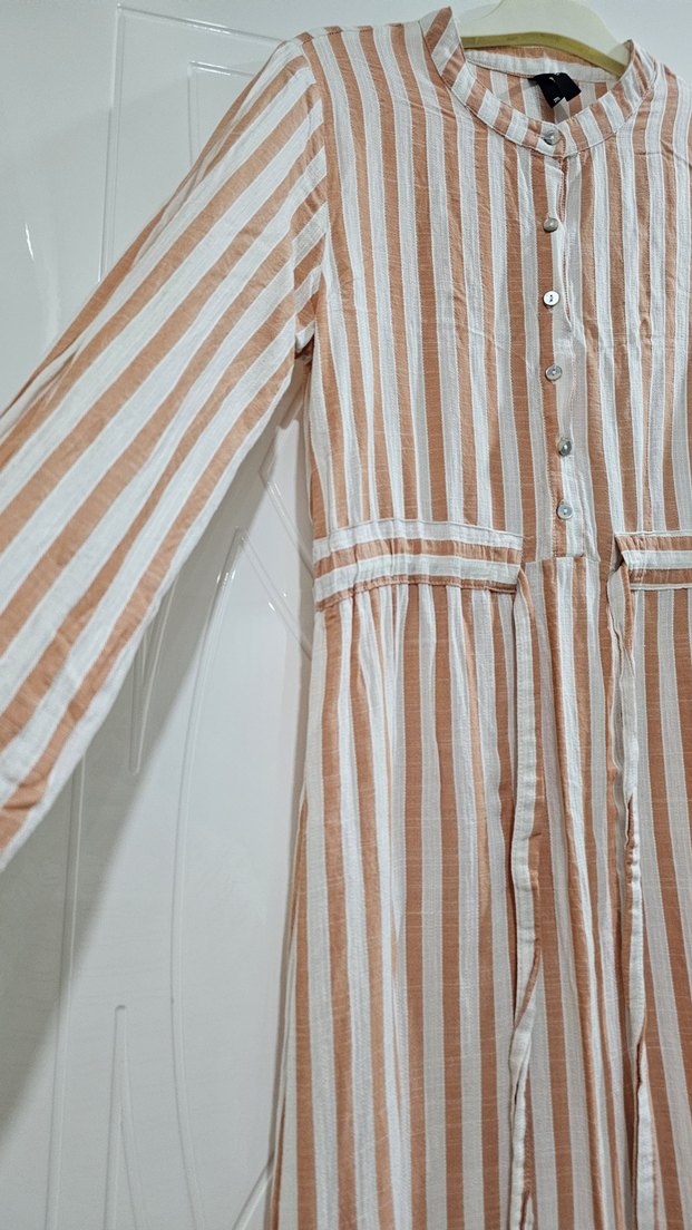 Bej renkli, çizgili ve bol kesim uzun keten elbise. Uzun kollu, kayık yaka Defacto ürünü