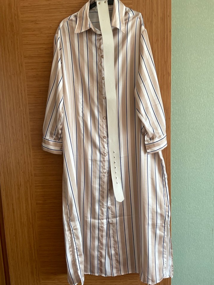 1 kez giyildi. Yanlardan yırtmaçlı, defosuz saten. Bej renkte, çizgili desenli uzun kadın elbisesi, regular fit ve klasik yakaya sahiptir. Strappy kollu, Paris tarzı günlük kullanıma uygundur.