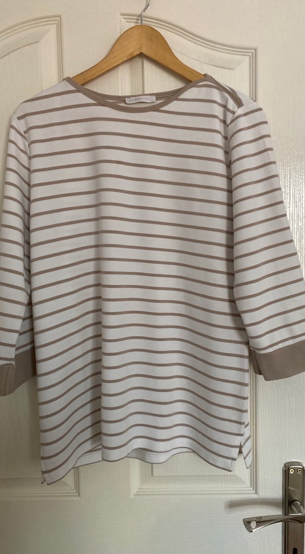 Bej ve gri çizgili, yumuşak pamuk kumaştan, uzun kollu ve salaş kesim hamile tişörtü, rahat günlük kullanım için uygun.