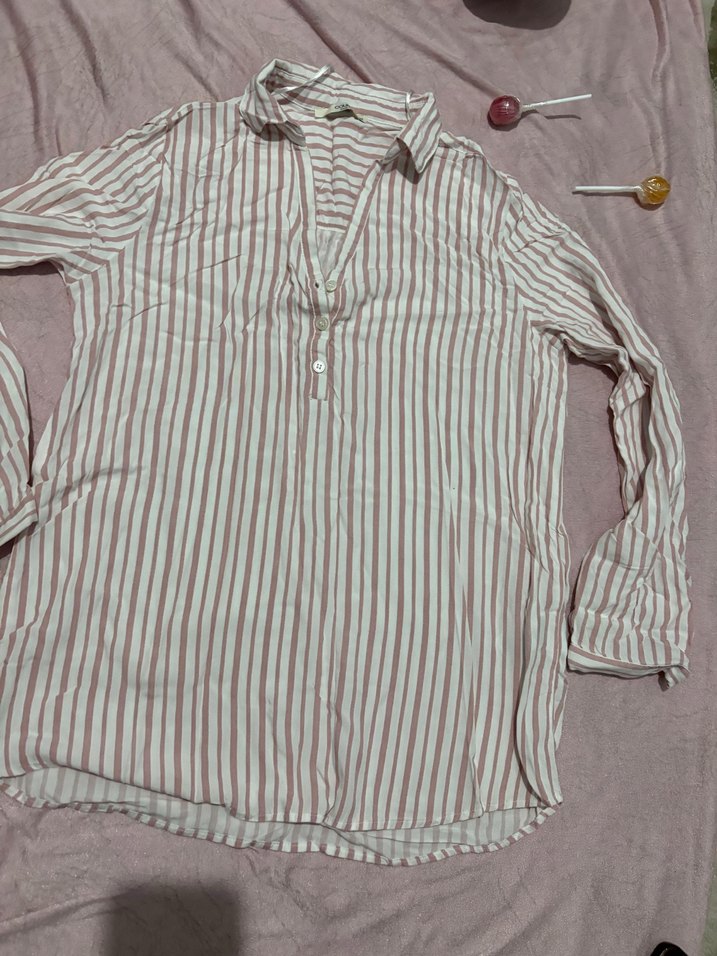 Yumuşak pamuk kumaştan, düğmeli ve yakalı, bol kesim uzun kollu gömlek. Pastel bej çizgili, rahat sokak stili için uygundur.