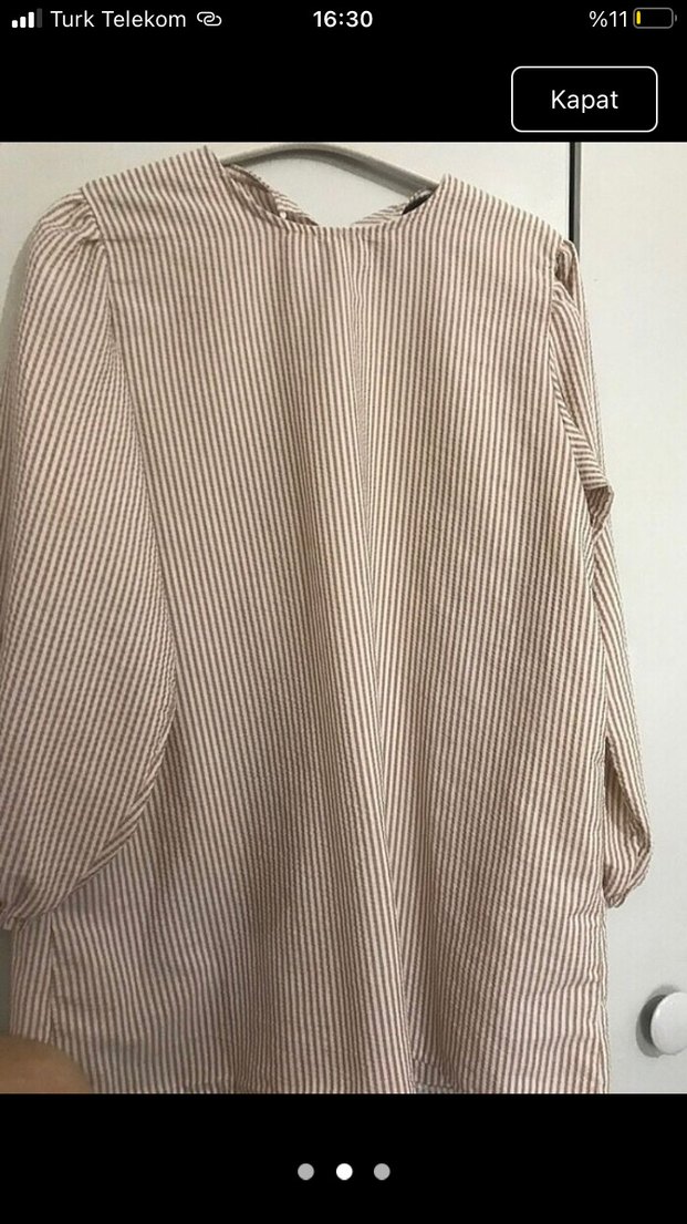 Bej çizgili gömlek, uzun kollu ve tekne yaka. Salaş kesim ve pile detaylarıyla günlük kullanıma uygun midi boyda.