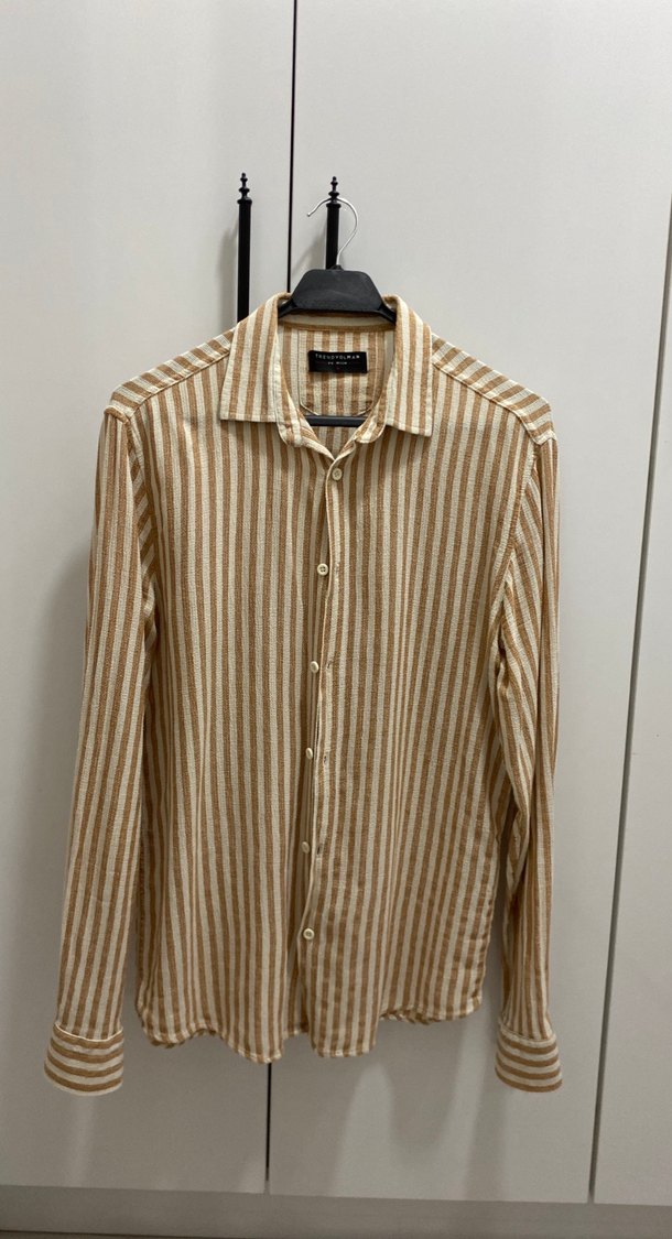 Bej çizgili, uzun kollu, yakalı erkek gömlek. Nefes alabilen keten kumaştan, düğmeli ve rahat kesim. Ofis ve günlük sokak stiline uygun.