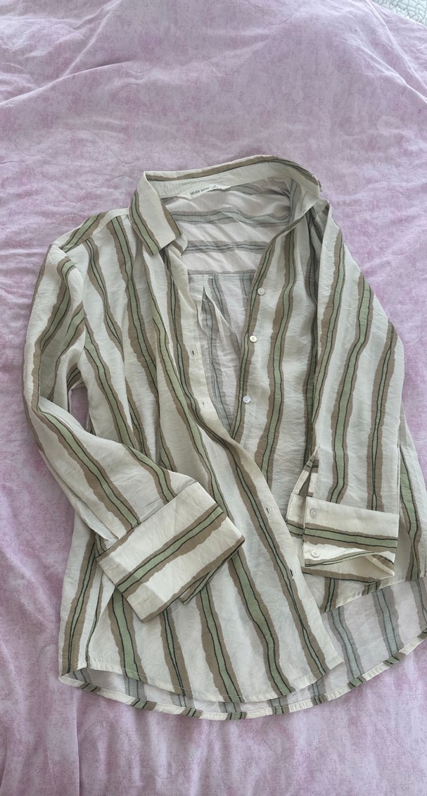 Yumuşak keten kumaştan, bol kesim, uzun kollu, yakalı ve düğmeli bej çizgili gömlek. Günlük kullanıma uygun rahat bir model.