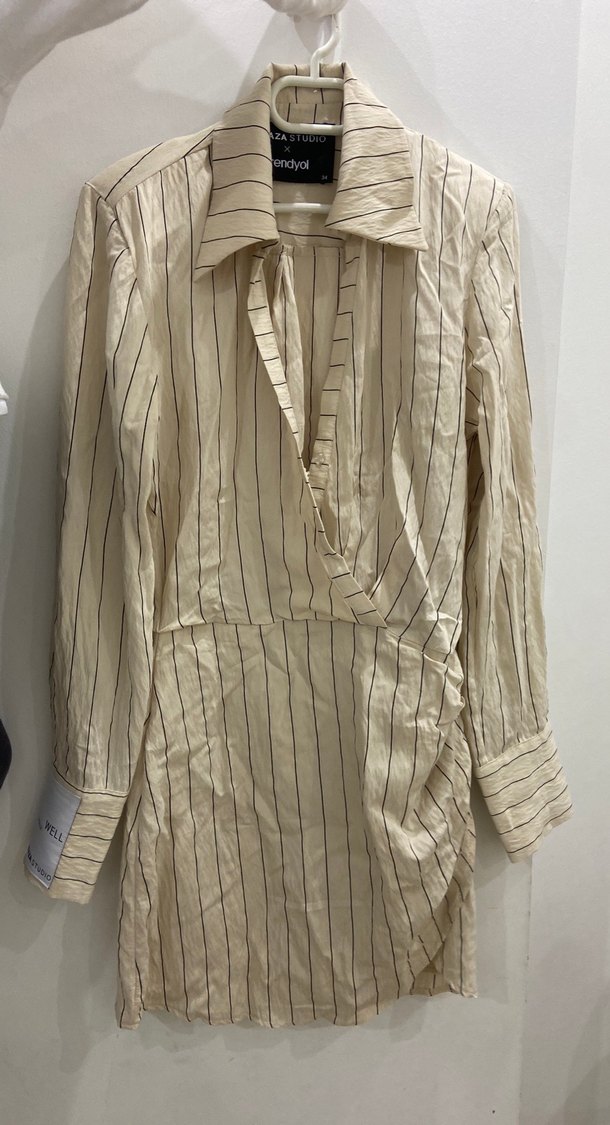 Bej keten gömlek uzun kollu, yakası kesik ve pilili detaylara sahip. Çizgili deseniyle ofis için uygun, rahat kesim ve trend tarzda bir üründür. 34 ama 36 yada olur bence
